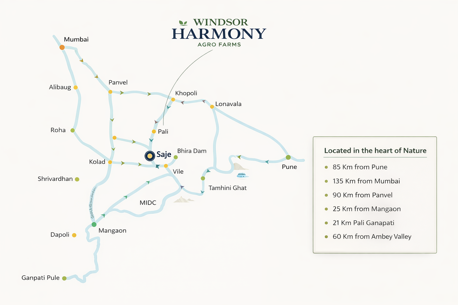 Situated in the scenic natural setting of Saje Mangaon down Tamhini Ghat in Konkan, a massive 30 acres of the project is now being developed as agro farm where every farmhouse plot will also be home to 60 trees of 18 different fruits and herbs species. These plants are selected and grown after extensive research for maximising health and monetary benefits to you.